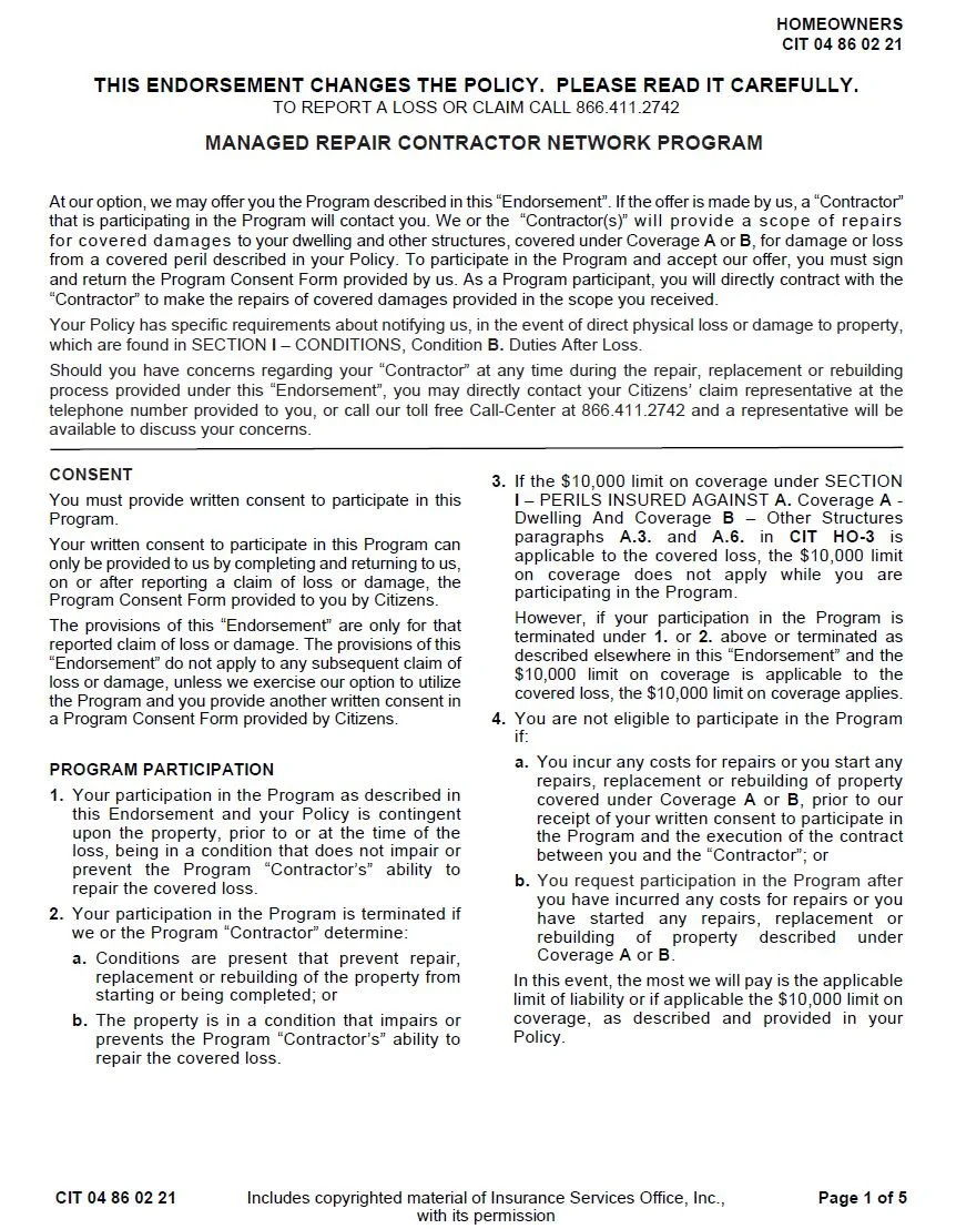 What to look for: Check if your policy contains endorsements like “Managed Repair Contractor Network,” “Option to Repair by Insurer,” or clauses giving the insurer the “exclusive right” to select your contractor.